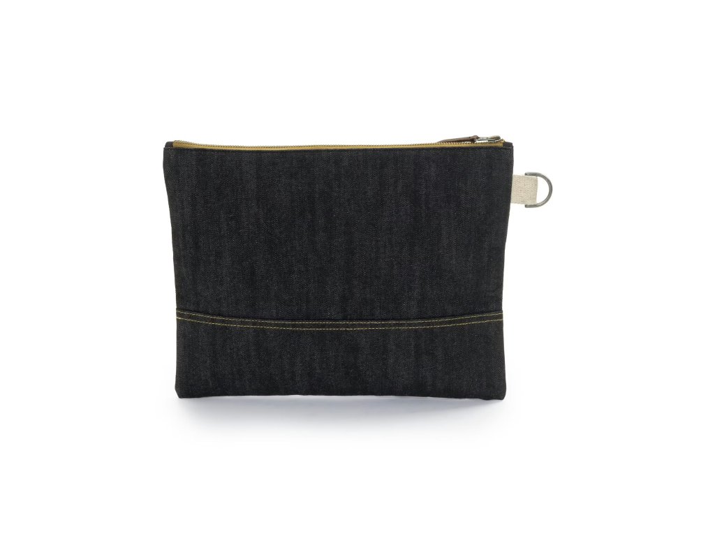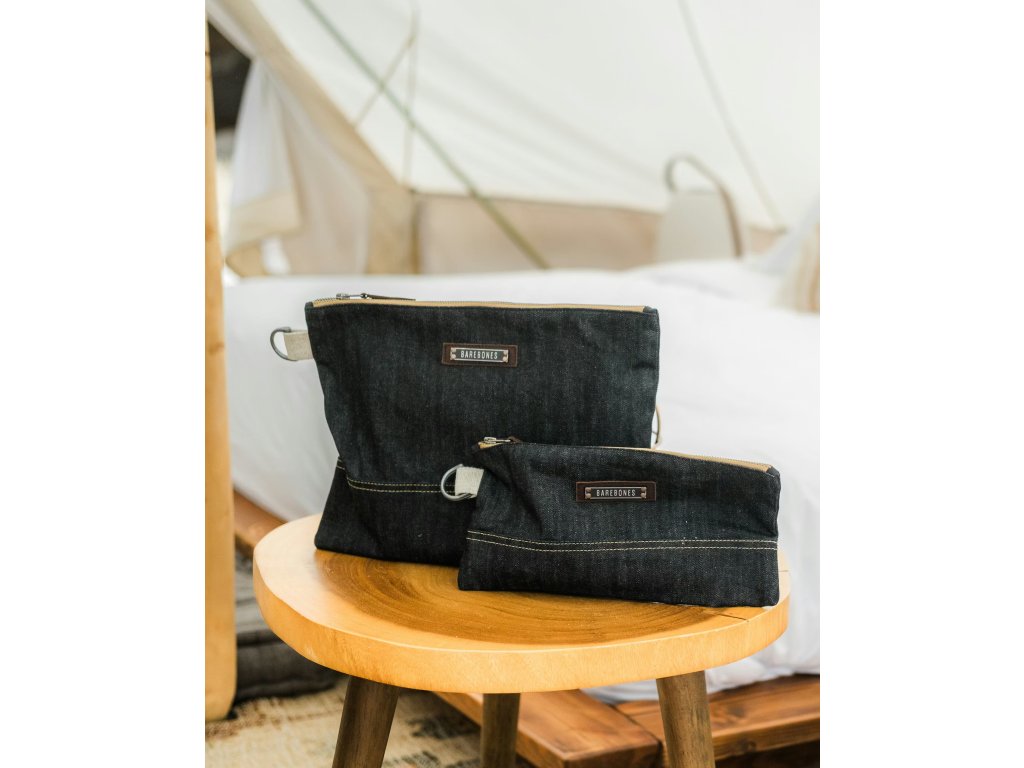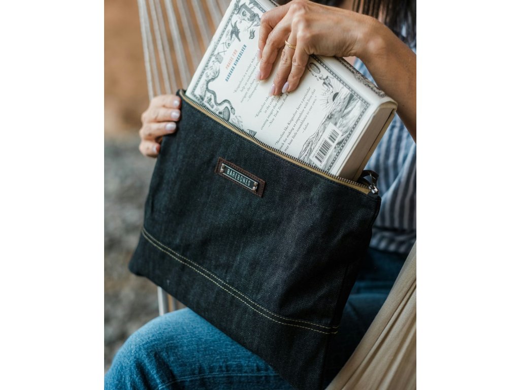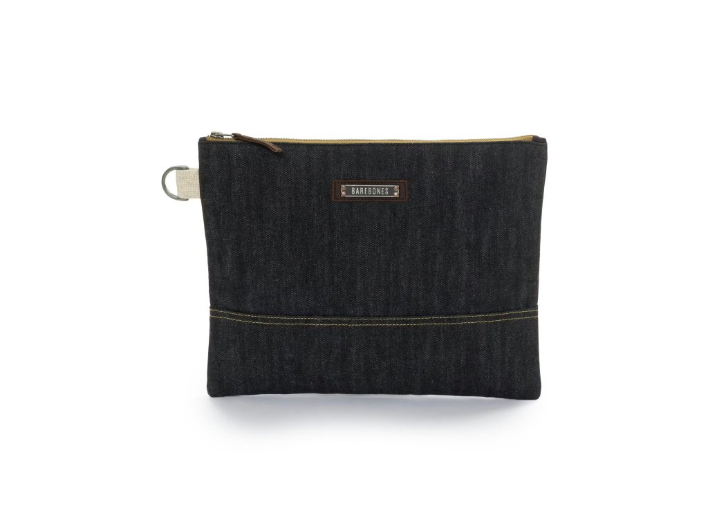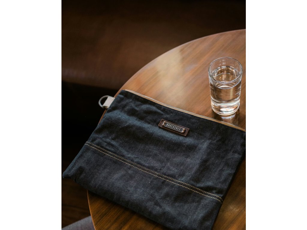 Neelum Zipper LARGE Pouch – Denim od značky BAREBONES je prostorné a mimořádně odolné pouzdro z extra silné voskované bavlněné džínoviny 14,5 oz (≈ 492 g/m²). Ideální pro tablety, čtečky, knihy, menší notebooky do 12" i cestovní vybavení.