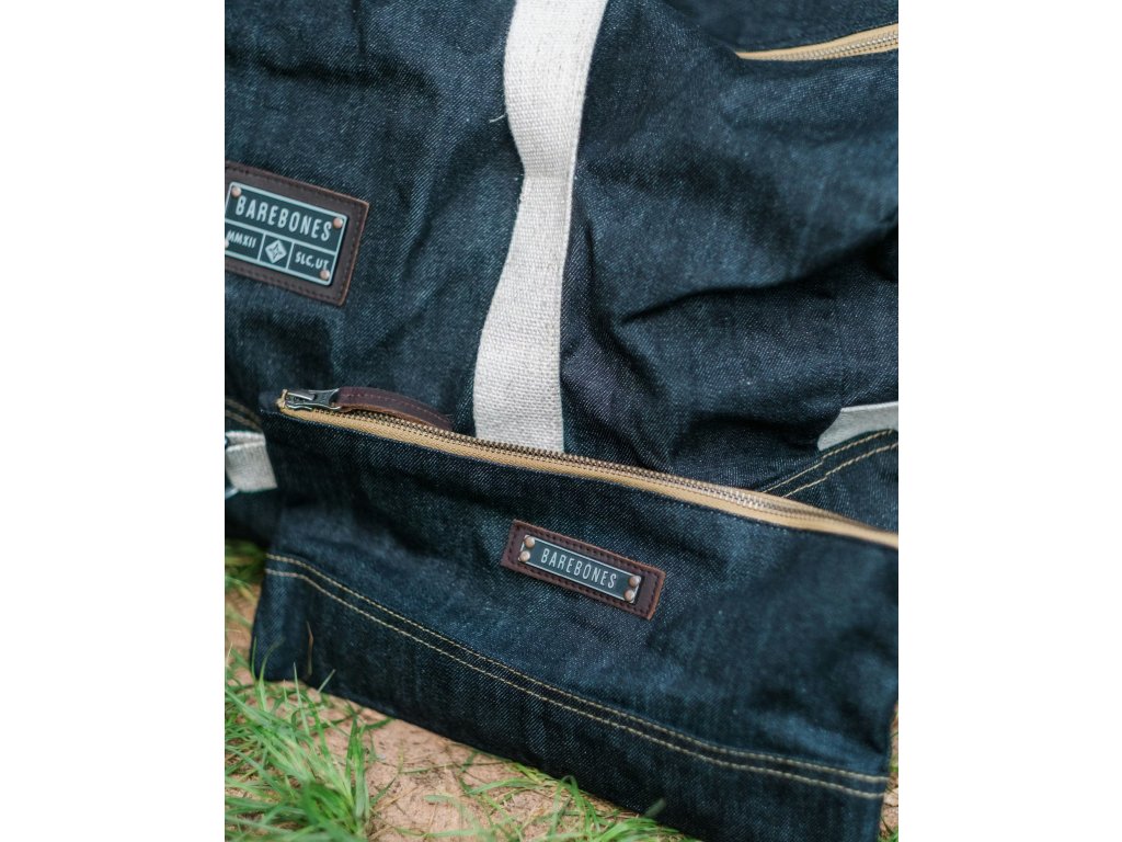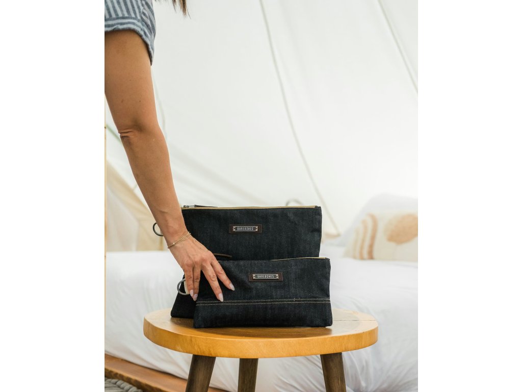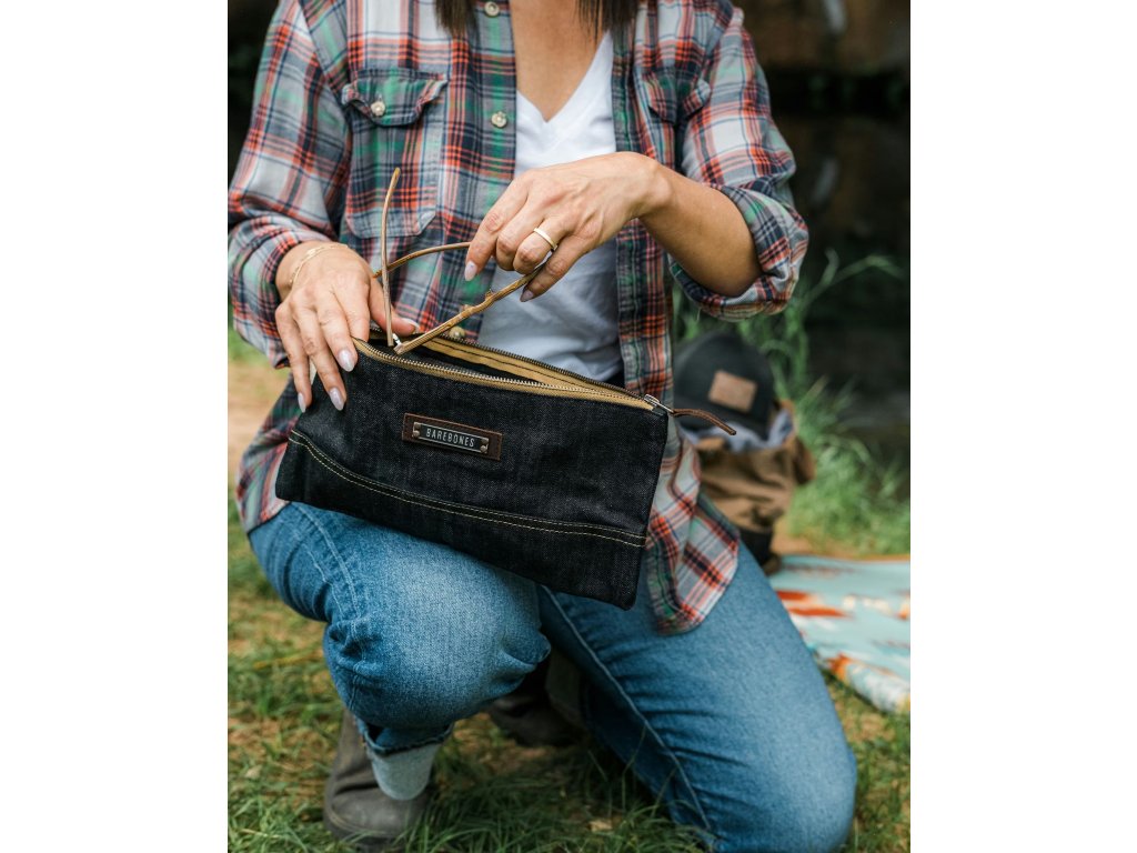 Neelum Zipper SMALL Pouch – Denim od značky BAREBONES je odolné a stylové pouzdro z extra silné voskované bavlněné džínoviny 14,5 oz (≈ 492 g/m²). Ideální pro každodenní drobnosti – techniku, kosmetiku i kancelářské potřeby.